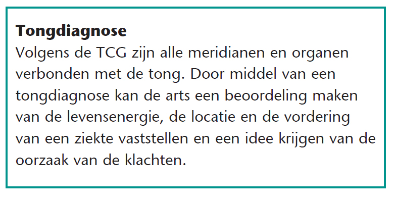 Een bezoek aan een Chinese geneeskundige begint net als bij een westerse arts met een uitgebreid gesprek waarin klachten worden besproken. Na dit gesprek volgt meestal een traditionele Chinese pols- en tongdiagnose.